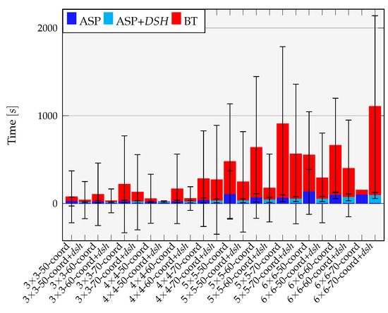 Regarding the time to derive a feasible system synthesis, by comparing the bars in Figure 7, the average time spend in the answer set solver and background theory solver is also always lower in the coordinated+DSH approach, and therefore is the average total synthesis time (with the exception of the single data point (single solved run) for 6 × 6-70-coord in Figure 7 which is neglected in our statement due to statistical relevance.)