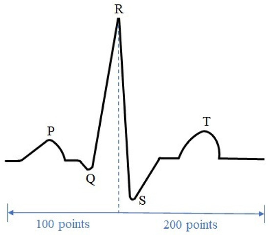 In recent years, wearable devices for continuous ECG monitoring have sprung up and drawn great interest in the scientific community, as they are easy-to-use, portable, low-cost, and do not require experienced experts [3]. Most works with a lack of further regard to ECG auxiliary diagnosis [4,5,6,7] have paid intensive attention to recording the ECG signals or detecting the QRS complex, which contains a Q wave, an R wave, and an S wave, as shown in Figure 1. In addition, some work sent obtained ECG data to remote servers in order to perform a huge amount of calculations that analyze the signal, due to the limited storing and computing abilities of wireless sensor nodes [8,9]. Such solutions introduced new problems associated with transmission speed, data security, and device reliability. To avoid these issues, our approach proposes that the heartbeat classification algorithm is directly implemented on low-power wearable devices for automatic continuous diagnosis in real time.