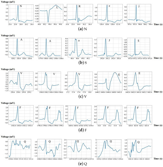 Segmentation of the successive ECG signals is indispensable for extracting morphological features and classifying abnormal heartbeat. In most work, segmenting the ECG signal first requires identifying the R-wave peak [7,25]. At first, the position of the R-wave peak in each heartbeat can be located by reading the entire annotation provided by the MIT-BIH dataset; it is the strongest peak in each heartbeat. Alongside this, we also adjust the peak values in the annotation file, as several signal points are offset after denoising. Accordingly, there is no need to propose another algorithm for acquiring QRS complexes and detecting the R peak. Second, we remove the first 10 and last 5 consecutive beats to ensure that our analyzed data are from the steady state. Finally, for the sake of extracted feature vectors with the same length and containing P, QRS, and T wave information, based on the determined R-wave peak, we take 100 points forward and 200 points backward as a heartbeat. Figure 2 shows different types of heartbeats after segmentation. Table 1 describes the number of final obtained heartbeats from the 44 ECG records in the MIT-BIH database.