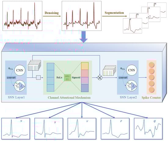 Arrhythmia classification algorithms in most previous work were typically based on artificial neural network (ANN), recurrent neural network (RNN), or deep convolutional neural network (CNN) with multiple layers and complex recursion structures to improve classification accuracy [12,13,14,15,16]. These approaches result in dramatic increases in hardware costs, deployment complexity, power consumption, and assessment time. Unlike the information processing of CNN, binary event-driven spiking neural network (SNN) neurons are only active when receiving and generating spikes, in contrast to remaining idle at the free event time [17]. The SNN with binary information (0 or 1) transmission consumes energy only when generating spikes, which is well suited for low-power hardware. In addition, SNN processes information with sparse asynchronous spikes, and it makes use of fewer operational quantities than the convolution operation via floats. With respect to this issue, our network model is based on SNN layers with leaky integrate-and-fire (LIF) neurons to achieve higher energy efficiency, as this takes advantage of simple structure, high performance, and reliability.