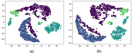 - The t-SNE visualization of denoised ECG data: The dataset for training and testing consists of 44 ECG recordings: 100, 101, 103, 105, 106, 108, 109, 111, 112, 113, 114, 115, 116, 117, 118, 119, 121, 122, 123, 124, 200, 201, 202, 203, 205, 207, 208, 209, 210, 212, 213, 214, 215, 219, 220, 221, 222, 223, 228, 230, 231, 232, 233, and 234. Five major groups (N, S, V, F, and Q) of heartbeat data are all taken into account, so that our classification method can be extensively implemented in clinical arrhythmia diagnosis. We select the concise F1 score in Equation (13) as the main indicator to assess each class. In addition, to make the most of available ECG data to design the optimal model, all extracted heartbeat data are randomly split into a training set (70%) and a testing set (30%). In Figure 4, we carry out t-SNE visualization to compare the feature separability of the denoised data with the raw data that are selected from records 208 and 232 in the MIT-BIH arrhythmia database.