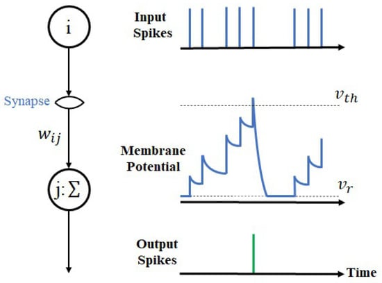 The leaky integrate-and-fire (LIF) model is the most utilized neuron for SNN, and incoming signals have a direct influence on its membrane potential, as generalized in Figure 5. Clearly, the LIF neuron model transmits information effectively by exciting non-differentiable discrete spikes, which is why it cannot train the network by means of standard backpropagation [29].