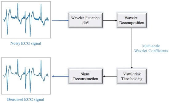 We selected the Daubechies 5 (db5) wavelet as the wavelet function with a decomposition level of 9 to transform noisy ECG signals into the frequency domain and obtained a set of wavelet decomposition coefficients [23]. If the obtained wavelet coefficient exceeded the soft threshold, it was determined as noise and needed to be discarded. In contrast, if the wavelet coefficient was greater, it could be assumed as the signal and needed to be retained. Based on the soft thresholding of [32], the setting threshold was calculated by the following formula: