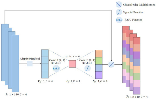 After that, the feature vector is fed into a bottleneck structure for better utilization of aggregated information produced by the GMP layer. This bottleneck structure is composed of two convolution layers with a kernel size of 1 with a hidden layer between them. With the reduction ratio r (here r is 4), the number of neural units in the hidden layer is first reduced to of the input convolution layer, and then the output convolution layer adopts the same number of neural units as the input convolution layer to obtain a new channel-wise feature with a size of 1 and channel number of C. The rectified linear unit (ReLU) layer follows the first convolutional layers, which can introduce sparsity to control overfitting and speed up computing time [33]. After the last convolutional layer, the sigmoid activation layer is utilized, so that contains non-mutually exclusive multiple channel information and is normalized between 0 and 1. These operations are calculated according to the following formula: