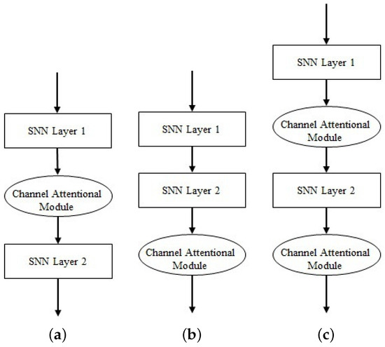Figure 8. Three integration designs for the CAM. (a) CAM-Between block. (b) CAM-After block. (c) CAM-All block.It currently remains challenging to report a rigorous theoretical analysis for multi-channel representations learned by deep neural networks [21]. Thence, we conduct a series of ablation experiments to examine the practical function of the integrated CAM position, and the experimental results are listed in Table 4. The CAM-Between block performs the best with the least increase of model parameters, whereas the CAM-After integration leads to dramatically worse performance and even drops below the baseline module (containing only two SNN layers). The CAM-All block is not quite as accurate as the CAM-Between block due to the effect of the CAM after SNN Layer2. This demonstrates that a careful integration strategy is quite significant for the channel attention module to bring more performance benefits.