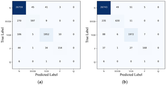 Figure 9. The confusion matrix heatmaps of heartbeat classification: (a) confusion matrix for the original SNN-based model; (b) confusion matrix for the SNN-based model integrated with the CAM.