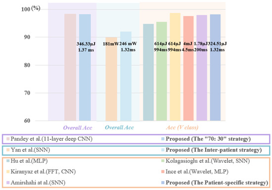 Referring to the Inter-patient strategy to make similar proportions for each type of heartbeats, the training dataset contains 22 ECG records (101, 106, 108, 109, 112, 114, 115, 116, 118, 119, 122, 124, 201, 203, 205, 207, 208, 209, 215, 220, 223, and 230) and the testing dataset contains the remaining ECG records (100, 103, 105, 111, 113, 117, 121, 123, 200, 202, 210, 212, 213, 214, 219, 221, 222, 228, 231, 232, 233, and 234). Relative to [19], despite our work producing a slightly higher power consumption, there are higher scores in terms of the overall accuracy and F1 scores for class N and class V.