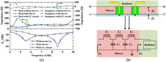 Based on Equations (2) and (3), and the impedance extracted from simulation, the sleeve’s equivalent circuit model is constructed and shown in Figure 3b. The curve fitting method is used to find the values of the inductors and capacitors to be: L1 = 372.22 pH, L2 = 1.75 nH, L3 = 749.27 pH, C1 = 240.26 pF, C2 = 196.13 pF. As plotted in Figure 3a, the results suggest the impedance and S11 curves with LC circuit are identical to those with sleeves.