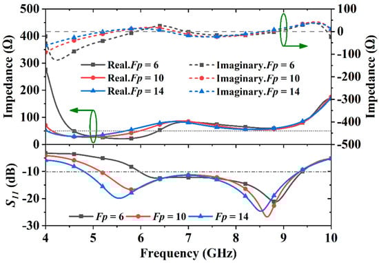 As shown in Figure 4, the results reveal that Fp determines the lower bound of the antenna. When Fp is 6 mm, the antenna’s real part impedance changes from 275 Ω to 20 Ω, and the imaginary part impedance keeps far away from 0 Ω in the frequency band from 4 GHz to 6 GHz. The antenna is matched well, starting from 6 GHz. Increasing Fp to 10 mm, the imaginary part impedance of the antenna varies from −90 Ω to −20 Ω in the frequency band of 4 GHz to 5.1 GHz; the corresponding reflection coefficients are below −10 dB beginning at 5.1 GHz. When Fp is 14 mm, the antenna has a good matched bandwidth from 4.8 GHz to 9.4 GHz, corresponding to a fractional bandwidth of 64.8%.