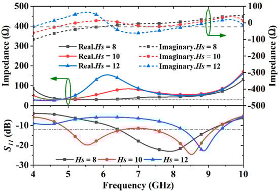 The impedance tuning effect of the sleeves’ height (Hs) is shown in Figure 5. When Hs = 8 mm, the imaginary part impedance ranges from −55 Ω to −20 Ω from 4.8 GHz to 6.14 GHz. In this case, the fractional bandwidth is 41% (6.14–9.32 GHz). When Hs is 10 mm, the antenna is matched well from 4.8 GHz to 9.4 GHz with a bandwidth of 64.8%. Increasing Hs to 12 mm, the real part of the impedance reaches 155 Ω and the imaginary part of the impedance experiences a large change from +60 Ω to −60 Ω around 6.1 GHz. The corresponding reflection coefficients from 4.8 GHz to 8 GHz are above −10 dB with a decreased bandwidth of 17% (8–9.5 GHz). The results suggest wider bandwidth can be achieved when Hs = 10 mm while all other dimensions are held unchanged.