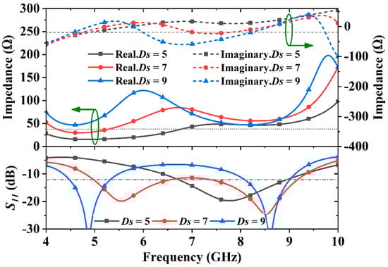 The impedance controlling effect associated with the sleeves’ inner diameter (Ds) is shown in Figure 6, which demonstrates that an optimal value of Ds yields the widest bandwidth. When Ds is 5 mm, the antenna’s real part impedance is much below 50 Ω from 4.8 GHz to 6.4 GHz, which gives a bandwidth of 37% (6.4–9.3 GHz). When Ds = 7 mm, all the reflection coefficients from 4.8 GHz to 9.35 GHz are smaller than −10 dB with a bandwidth of 64.8%. When Ds is 9 mm, there is a peak value of 120 Ω of the real part impedance at 6 GHz, and the imaginary part impedance is much smaller than 0 Ω in the bandwidth from 5.5 GHz to 7.9 GHz. In this case, the maximum bandwidth is only 23% (4.36–5.5 GHz). These results indicate that broader bandwidth can be obtained around Ds = 7 mm when all other dimensions are unvaried.