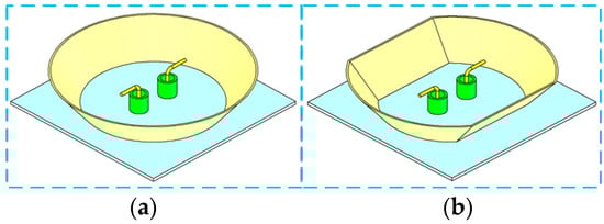 In the second design phase, a reflecting cavity is put outside the dipole to elevate the antenna’s boresight gain. Two cavities, as shown in Figure 7, are studied and have been compared to show the bathtub-shaped cavity’s advantage in this design. The cavity’s critical dimension variables have been investigated to reveal their influences on the antenna’s gain performance. When the cavities are applied, the dimension parameter’s value of Fp is adjusted accordingly to keep the antenna working in the bandwidth of 4.8 GHz to 9.4 GHz.