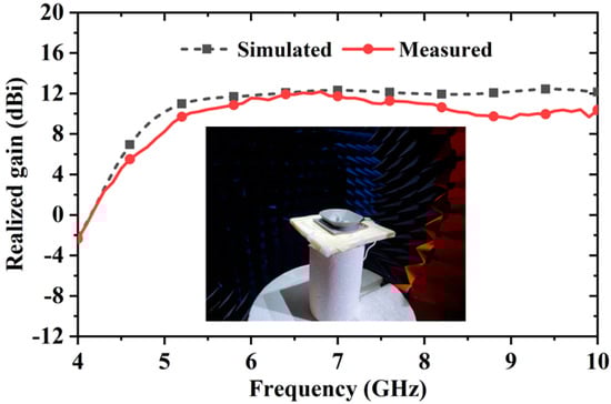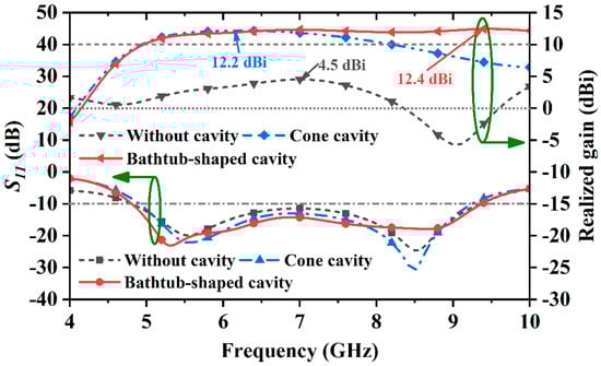 The results in Figure 8 indicate that utilizing the bathtub-shaped cavity can obtain higher and stabler gain values than the other. Figure 8 shows the realized gain values of the antenna with the cone cavity decrease from 12 dBi to 7.2 dBi from 7 GHz to 9.4 GHz. By contrast, the realized gain values maintain around 12 dBi from 7 GHz to 9.4 GHz because of using the bathtub-shaped cavity. The bathtub-shaped cavity brings about a wider 3-dB gain bandwidth of 63% (4.9–9.4 GHz) with a higher average realized gain of 11.8 dBi. While the antenna with the cone cavity provides a 3-dB gain bandwidth of 57% (4.8–8.6 GHz) with an average realized gain of 10.7 dBi.