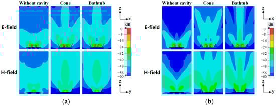 The field distributions at 6 GHz in Figure 9a show that both the electric and magnetic field distributions of the antenna in the boresight direction are weak and the radiation is strong on the two sides of the antenna when there is no cavity. The field is redistributed and the radiation is focused in the boresight direction by employing the cone and bathtub-shaped cavities. Figure 9b further shows that the electric and magnetic field is not distributed in the boresight direction and the antenna nearly does not radiate in the boresight direction when no cavity is applied at 9 GHz. By contrast, the bathtub-shaped cavity significantly focuses the radiation power in the boresight direction. The cone cavity has a similar but weaker redirecting effect compared to the bathtub-shaped cavity. Field distributions at different frequencies indicate that the bathtub-shaped cavity delivers higher and stabler gain values in the antenna’s bandwidth.