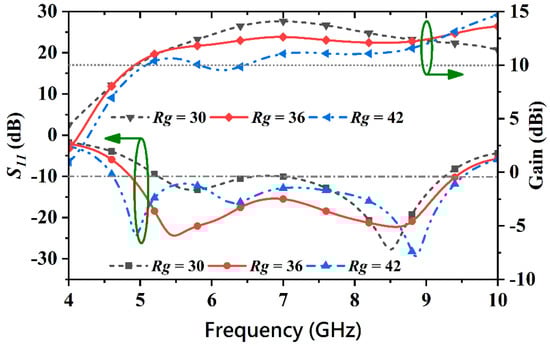The results in Figure 10 suggest that selecting an optimal value of Rg can obtain higher gain and broader impedance bandwidth simultaneously. When the Rg = 36 mm, the average gain is 12 dBi with a fractional impedance bandwidth of 64.8% from 4.8 GHz to 9.4 GHz. When Rg is 30 mm, the average gain increases from 12 dBi to 13 dBi while the impedance bandwidth decreases to 55% (5.3–9.3 GHz). Increasing Rg to 42 mm, the average gain decreases to 10.7 dBi with a slightly increased impedance bandwidth. A wider impedance bandwidth and higher gain can be found simultaneously when Rg is near 36 mm, with all other dimensions remaining unchanged.