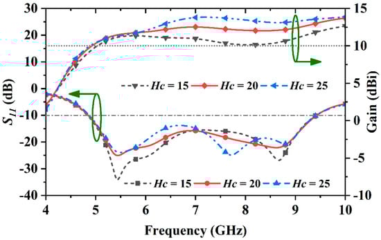 The S11 and boresight gains for different values of Hc.