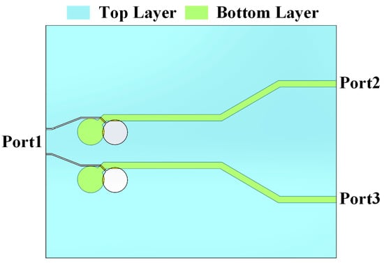 An ultra-wideband balun [] using slotline-to-microstrip transition is adopted to feed the antenna. The structure of the balun is shown in Figure 12. Rogers RO4003C laminate (Rogers Corporation, Chandler, AZ, USA) with a thickness of 0.508 mm is used as the balun’s substrate.