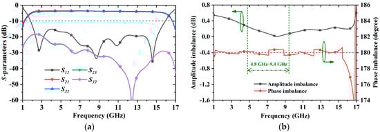 The performance of the balun is shown in Figure 13. The S-parameter curves in Figure 13a indicate that the balun works well over the frequency band of 1.8–16 GHz. Figure 13b plots the balun’s amplitude and phase balance performance. The amplitude difference is less than 0.5 dB, and the phase imbalance is 180 ± 1.9° between the two output ports from 1.8 GHz to 16 GHz. The results suggest that the balun can feed the proposed antenna efficiently.