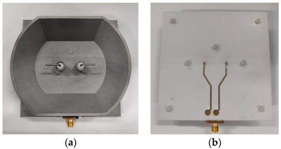 Figure 14 demonstrates the integrated structure of the proposed antenna and the feeding balun. The proposed antenna was fabricated using aluminum alloy material with 3D printing technology. The balun is placed at the bottom of the proposed antenna. The feeds of the dipole are soldered to the balun’s output ports.