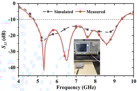 Anritsu Vector Network Analyzer (Anritsu, Atsugi, Japan) is used to measure the reflection coefficient of the prototype antenna that is shown in Figure 15. The measured impedance bandwidth is 64.6% (4.78–9.34 GHz) with a reflection coefficient < −10 dB, which shows a good agreement with the simulated one.