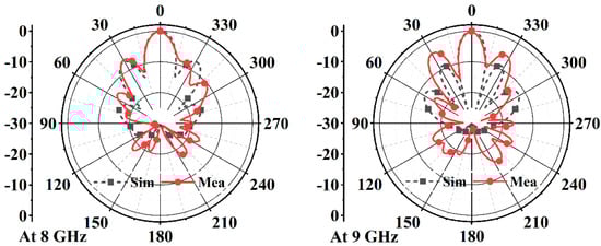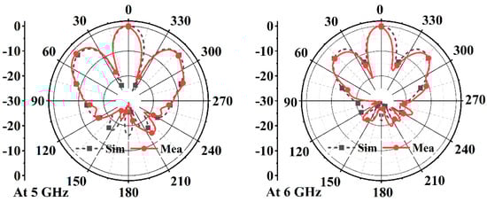 The antenna’s radiation performances were measured in the anechoic chamber in our institute. As shown in Figure 16, the measured radiation patterns agree well with the simulation, specifically at 5 GHz, 6 GHz, and 8 GHz, except for the small differences between measurement and simulation about the side-lobes’ amplitude around +/− 30 degrees at 9 GHz. The well-shaped radiation patterns ensure the antenna achieves high gain values in the antenna’s impedance bandwidth, as demonstrated in Figure 17. The gain curves show that the antenna’s gain averages at 10.6 dBi, which is 1.2 dB smaller than the simulation. Our analysis shows that the discrepancy in gain values may result from small fabrication and measurement errors.