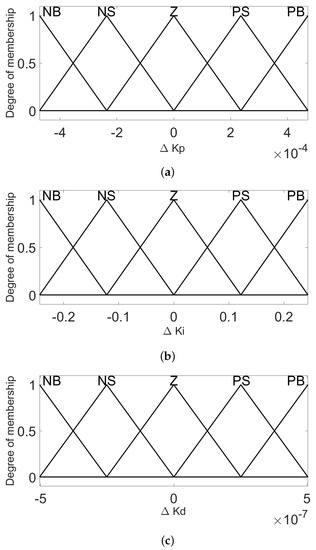 where , and are the initial gain value of the proposed FOPID controller and , , the scaling factors computed from FLC. For simplicity, the Mamdani-type fuzzy inference system is applied while the deviation ranges of output variables (universe of discourse) were defined as 50% of each initial gain value. For membership functions, the triangular shape was used for input and output fuzzy sets. As regards the linguistic variable names, the membership functions were denoted as NB (negative big), NS (negative small), N (negative), Z (zero), P (positive), PS (positive small), PB (positive big) and they are depicted in Figure 6 and Figure 7. From Table 5, Table 6 and Table 7, the rule base used for each output is shown. It is remarkable that the universe of discourse from the input variables is between and 1 due to their normalization upon the voltage reference and a digital design of the FLC with a sampling time of s. The gain inserted before the fuzzy inference for the error and the change-in-error were and 2, respectively. Finally, the center of gravity defuzzification method is selected to determine the crisp output.