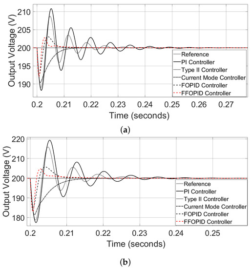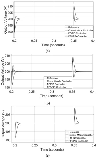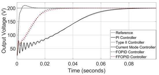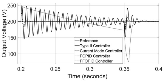 The first case to be analyzed is the transient behavior during startup. Applying an input voltage of 200 V, Figure 8 depicts step responses of different controllers during startup. Notice that the FFOPID controller respects the maximum voltage overshoot of while the Current Mode controller reaches . However, this trade-off is remarkable with the rise time.