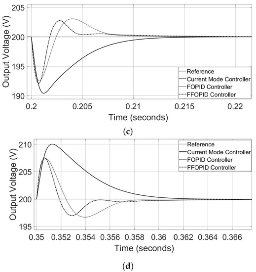 As regard to the second case, the load disturbance was analyzed. The resistance R was changed by a step response after 200 and 350 ms from the startup. Figure 9a shows the voltage response over the R disturbance from to and Figure 9b from to . It is remarkable that the FFOPID controller has the fastest stability over the load disturbance through Figure 9a–d, even with only one voltage sensor. When the load disturbance is changed towards the above, it is noticeable that the FFOPID controller is still stable for high resistances as seen in Figure 10 while the Current Mode Controller is unstable. The PI controller was not drawn due to their high instability. The changing load from to 10 k represents the operation from full load to a practically non-load. No conventional controllers can handle such high disturbance and thus, the viability of the proposed FFOPID controller is demonstrated.