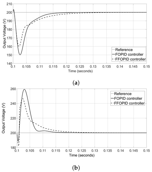 Finally, the last case assesses the enhancement of the FFOPID against the FOPID under step control variable disturbances at the instant s, without capacitance and inductance deviations. With the online updating of the gain parameters provided by the FLC, a relative improvement in amplitude of of the FFOPID against the FOPID when a step control variable disturbance of from the nominal Duty Cycle is applied can be seen in Figure 13a. In Figure 13b, a relative enhancement is found in the amplitude of of the FFOPID against the FOPID when a step control variable disturbance of from the nominal Duty Cycle is applied. By performance indexes comparison, besides ITAE and ITSE, the Integrated Absolute Error (IAE) and the Integrated Squared Error (ISE) were deployed to measure the behavior of the FFOPID and FOPID controllers during the control variable disturbance event of from the nominal Duty Cycle. Table 10 shows these indexes when the time is measured from to s and sampled with s.