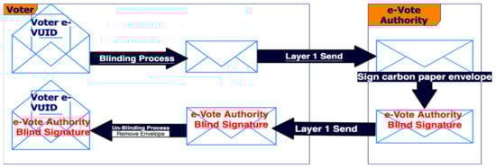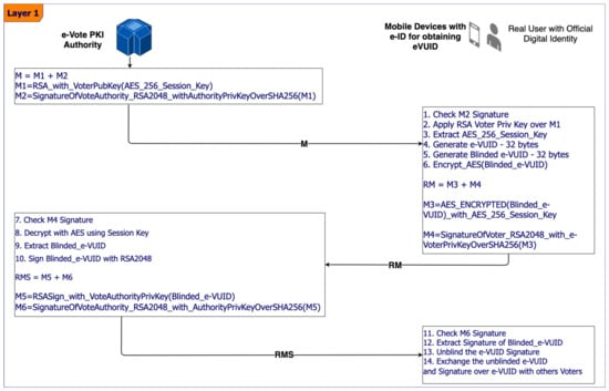 - Layer 1 (Top) is responsible for voters’ generation of the e-VUIDs (e-Vote Unique Identifiers) necessary for an anonymous ballot process. It is based on the blind signatures, and mainly, the voters generate 32 bytes VUID and obtain the blind signatures (RSA 2048 bits) from the e-vote authority.