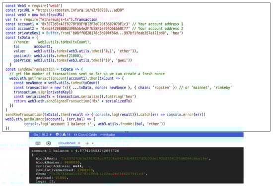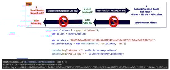 - For each private key (number), a public key on the elliptic curve secp256k1 is generated. From each public key, an Ethereum address for the e-vote process is generated, as shown in Figure 6.