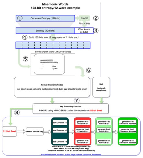 - The 512-bits seed is the input for the Master Private Key. If the HD wallet stores n Ethereum addresses, then it will store n private numbers and public keys. For each Ethereum address the HD wallet generates from the master key in a deterministic way the n private keys by adding a counter—step 8;