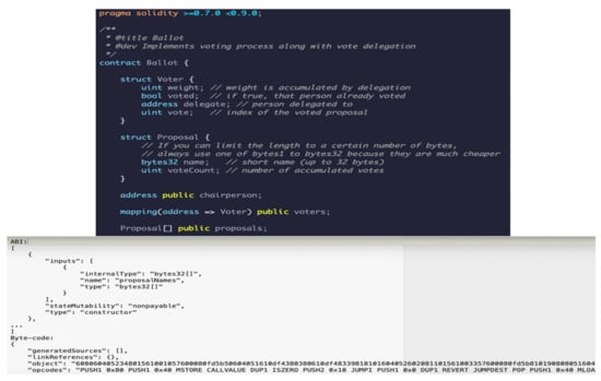 - EVM—Ethereum Virtual Machine—executes the bytecode produced from the smart contracts written in Solidity or Vyper. The authors used a Solidity smart contract for the anonymous e-vote process.