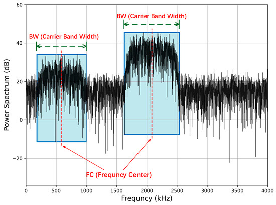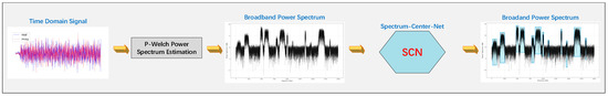 Figure 2 shows the end-to-end detection process of the carrier signal detection in the broadband power spectrum. First, for the wideband time-domain signal, we utilize the Welch method [26,27] to estimate the broadband power spectrum. Then, considering that the broadband power spectrum is an input of the network, the proposed SCN can automatically regress the FC and the corresponding BW of all subcarriers.