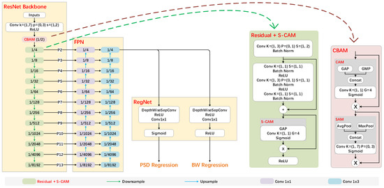 Figure 3 presents the architecture of the SCN, which includes three main parts, the residual backbone, the FPN neck, and the RegNet head. The inputs of the SCN are the 1D broadband power spectrum, and the model outputs are PSD and BW regressions. Moreover, all the local maximums of PSD regression are the subcarrier FC positions.