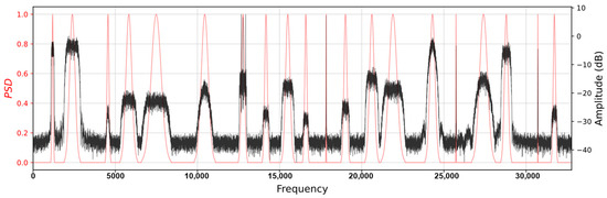 In Figure 4, the PSD targets are an example of the input power spectrum. Let be an input power spectrum of length . Therefore, we aim to produce the PSD outputs for the set output stride to a fixed value of 4 in SCN. Let be the score at the point in the predicted PSD, and let be the ground-truth PSD, where the subcarrier center denotes , corresponding to a detected keypoint, while the others are all background and . In accordance with [24,25], a 1D Gaussian kernel is used to produce the ground-truth at the frequency center of the PSD, where is 1/3 of the corresponding BW. If the two Gaussians overlap, we consider the element-wise maximum [32].