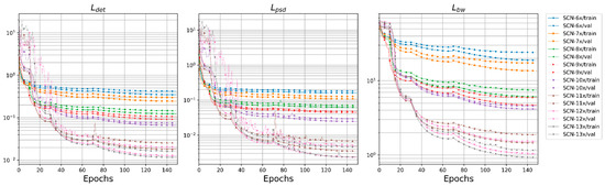The training and validation loss of different scales of SCN, where Ldet is the total loss, Lpsd is the PSD regression loss, and Lbw is the BW regression loss.