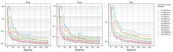 The training and validation loss of the SCN-11x trained with different numbers of simulation samples, where Ldet is the total loss, Lpsd is the PSD regression loss, and Lbw is the BW regression loss.