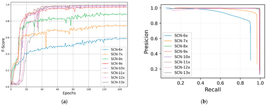 The performance comparison of different scales of SCN. (a) F-scores change with training epochs. (b) PR curve.