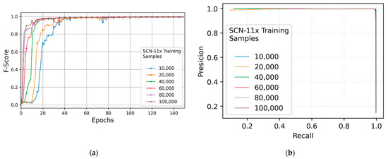The performance comparison of SCN-11x trained with different numbers of simulation samples. (a) F-scores change with training epochs. (b) PR curve.