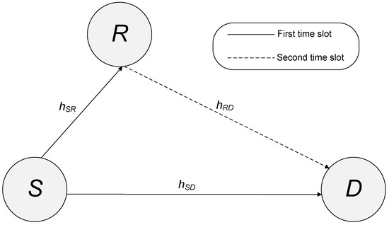 Meanwhile, relaying diversity wireless communications have garnered considerable interest in academic and industrial sectors owing to their favorable performance features such as link reliability, system capacity, and transmission range, as well as the ease of implementation that they provide [5,6,7]. There are typically two rounds in a relaying transmission system. In the first round, the relay and destination receive data from the source. During the following round, the source is idle while the relay conveys the source’s information to the destination. Simply, the relay link serves as a supplementary link o the main link that connects the source and destination. The processing of the message delivered from the originating node by the relay is a crucial component of the relaying diversity mechanism. Various processing strategies result in various relaying diversity protocols such as amplify-and-forward (AF), mixed-and-forward, compress-and-forward, and decode-and-forward [8,9]. AF is a straightforward technique, which utilizes a non-regenerative relay to transfer a scaled version of the incoming signal to the eventual destination.