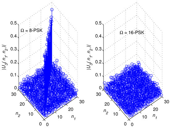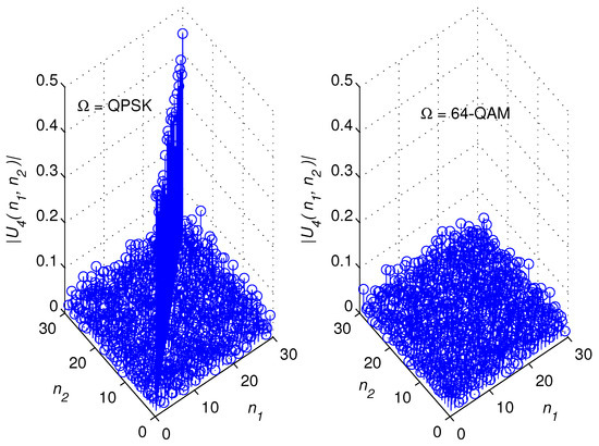 Snapshots of correlation functions magnitudes for various modulation forms are shown in Figure 2, Figure 3, Figure 4 and Figure 5 at a signal-to-noise (SNR) ratio of 20 dB and a number of symbol per frame of 5000. The channel parameters are specified as provided in Section 6. These findings are in agreement with the theoretical conclusions drawn earlier. In practice, the limited observation window causes nonzero peaks to occur at places where zeros should exist. However, these are statistically negligible over a long observation period.