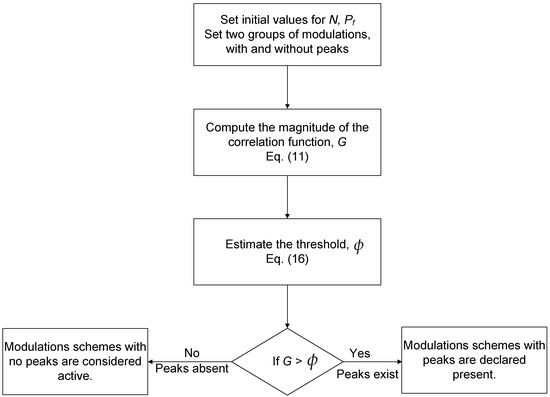 Note that in (11) and (12), we estimate the average value of the correlation function under consideration at . This value reflects for certain modulation types and for others with P representing the corresponding peak value and being the estimation error, which includes the contribution of channel noise as well as estimation imperfection due to using a limited number of samples. There are two possible hypotheses to be examined: