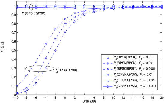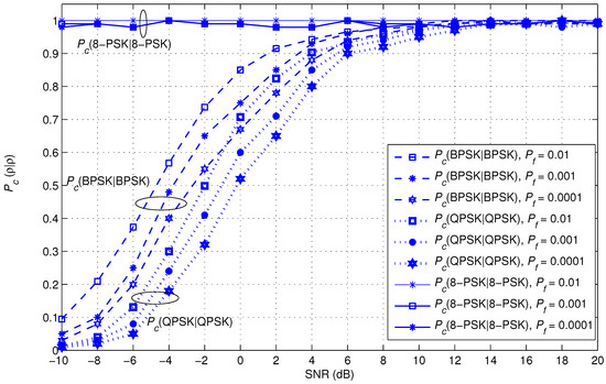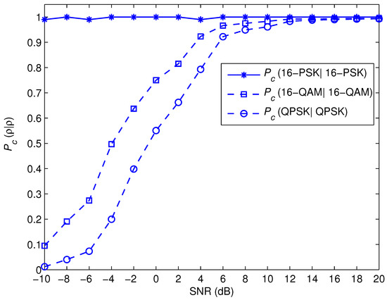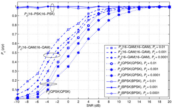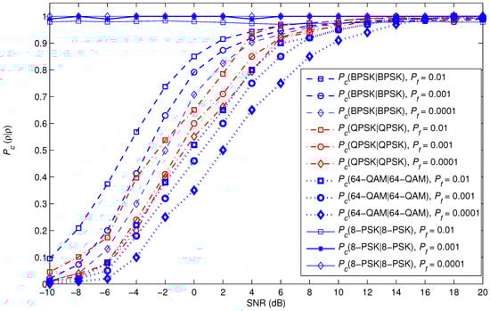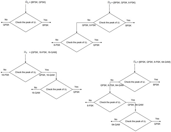 where and , is the path-loss exponent, is the distance between terminals and , and is the distance between terminals S and D. For the sake of the simulation, we assign , , , and . It is important to keep in mind that all distances have been normalized to . The probability of correct categorization, , is utilized as a quality factor for the proposed algorithm, where is one of the modulation kinds. Four distinct sets of modulation forms are investigated: , , , and . The corresponding flowcharts for those sets are shown in Figure 7. The number of simulation trials was 1000.