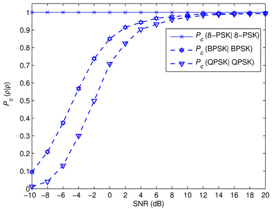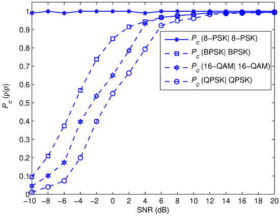 Figure 8, Figure 9, Figure 10 and Figure 11 illustrate the categorization performance for the modulation sets of , , , and , respectively, at different values of SNR. The findings indicate that the categorization performance of QPSK, 8-PSK, 16-PSK, 8-PSK of Figure 8, Figure 9, Figure 10 and Figure 11, respectively, are not affected by SNR levels. This is due to the fact that their performance is governed by the likelihood of false alert, which was set at 0.01. However, the other modulation options show substantial improvements as SNR increases. This is because, when SNR levels increase, the peak detection performance improves.