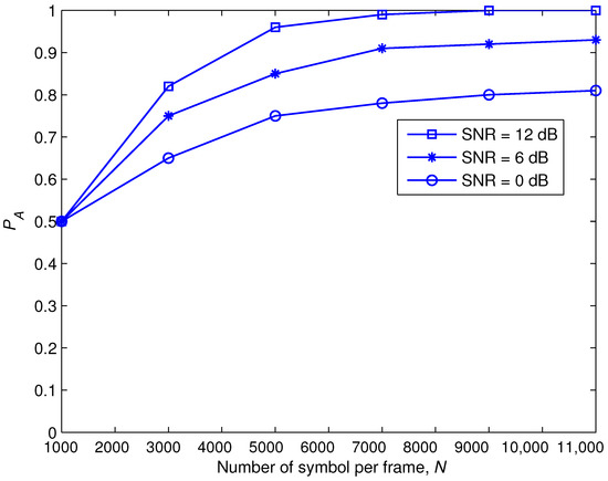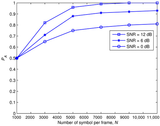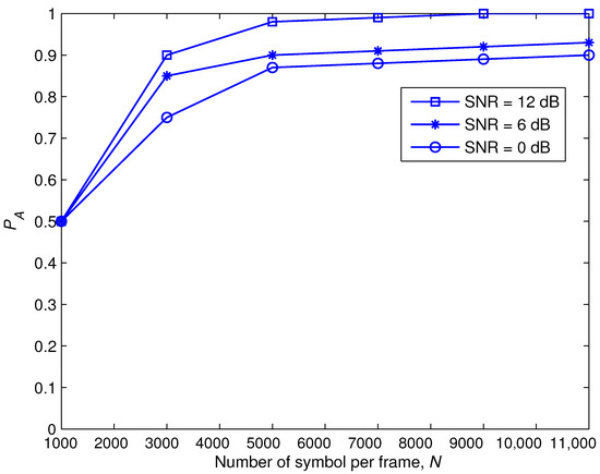Figure 16, Figure 17, Figure 18 and Figure 19 display the impact of the number of symbols per frame, N, on the average likelihood of categorization, , for , , , and , respectively. Increasing N even at moderate or low SNR levels leads to a considerable enhancement. This demonstrates how the impact of the estimating inaccuracy lessens as the number of observations increases. Even with a high signal-to-noise ratio, an unsatisfactory level of categorization performance is reached when N is sufficiently low to allow the influence of estimate error to predominate.