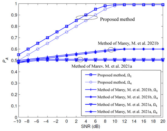 Figure 20 illustrates a comparison between the performance of the algorithm that is suggested and the performance of two other algorithms that were recently presented in [16,17]. The results show that the suggested method is superior to other algorithms. Even at high SNR levels, the other methods fail to provide good results. However, the suggested method provides almost perfect categorization performance. Recall that such methods are intended to function under the premise of channel coefficients and packet length knowledge; however, the suggested method does not.