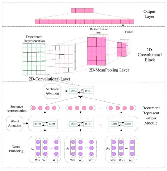 Despite the success of the approaches described above, we can conclude that these methods are proposed with a layer of LSTM or generic combination approaches of two neural networks. As a comparison, first, our method proposes bidirectional LSTM with two hidden layers. The difference is that BiLSTM can learn the dependences of the context from the forward and backwards directions. Using the structure of two-layer BiLSTM, we can extract more specific semantic information than when using standard LSTM. Second, the 1DCNN, which simply applies 1D convolution and 1D max pooling on the document matrix, may ignore the dependencies between features on feature dimensions and destroy the structure of the feature representation. Therefore, we use 2D convolution and 2D pooling operations to capture more local meaningful features. Third, we utilize the attention mechanism at the word-level and sentence-level. Compared with the use of either no attention mechanism or a one-layer attention mechanism, it is shown that our model could distribute different weights to words and sentences and focus on important sentiment information.