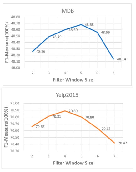 Figure 4 shows that the two datasets have different optimal filter window sizes. The Yelp2015 dataset could achieve the best properties when the filter size is 4, and the F1-Measure decreases when the size is away from 4. This probably because if the size is less than 4, the model cannot capture enough sentiment semantic information and relevant dependencies between two sentence features. Furthermore, the model may bring too much redundant information when the size is too large. As IMDB contains more sentences than Yelp 2015 (shown in Table 1), the optimal filter window of IMDB is larger than Yelp2015, with a value of 5.