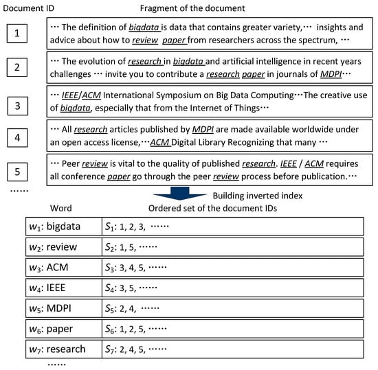 The inverted index is widely used for document retrieval [1]. For each word w in the document collections, an ordered set with respect to w is built that records the ID of documents containing w. An inverted index for document collections consists of the ordered sets for all words. Given a keyword , we can quickly obtain the ordered set for through the pre-built inverted index.